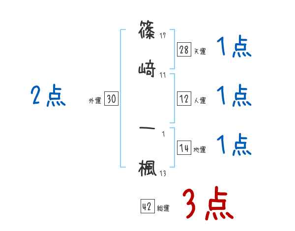 天運![]() | 篠﨑一楓さんの天運は28画の1つ星!家庭環境に注意。スポーツで活躍できる能力があるかも。 家系が持つ宿命的な運勢を表します。祖先から受け継いだ苗字ですので自分の力が及びません。家柄を象徴します。 |