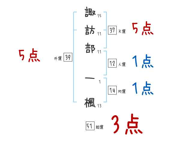総運![]() | 諏訪部一楓さんの総運は51画の3つ星!変化が激しく、危険に注意。堅実な性格。 あなたの人生を表す1番重要な運勢です。生涯を通じて影響する総合運となり、主に50歳以降の晩年期に影響を及ぼします。 |