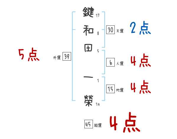 外運![]() | 鍵和田一榮さんの外運は39画の5つ星!社交性に優れ人望が厚い。人の上に立ち成功する。 生活面を象徴する運勢です。外部から受ける影響力を表し、結婚運、家庭運や職場、環境への順応性を表します。 |