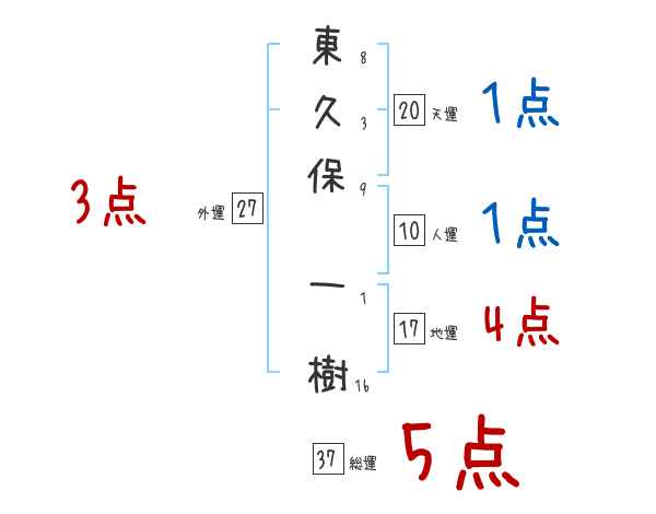 人運![]() | 東久保一樹さんの人運は10画の1つ星!不安を感じやすい傾向。ストレスを抱えないように注意しましょう。 性格や才能などを表す2番目に重要な運勢です。人間関係や協調性、社会的な成功に影響します。主に20歳から50歳ぐらいまでの中年期の運勢を表します。 |