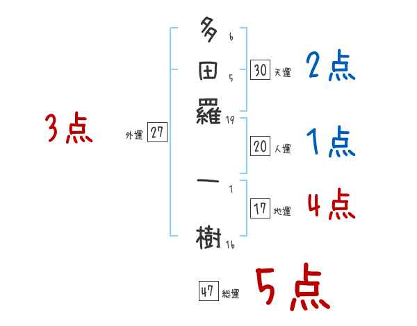 天運![]() | 多田羅一樹さんの天運は30画の2つ星!浮き沈みの激しさに注意しましょう。 家系が持つ宿命的な運勢を表します。祖先から受け継いだ苗字ですので自分の力が及びません。家柄を象徴します。 |