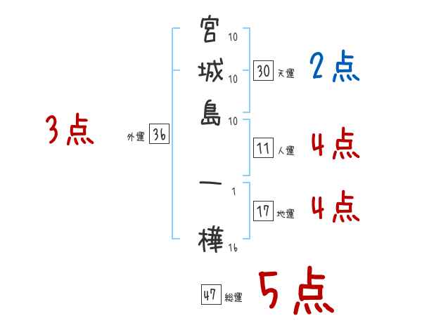 総運![]() | 宮城島一樺さんの総運は47画の5つ星!実力が開花し発展する円満な人生。財に恵まれる。 あなたの人生を表す1番重要な運勢です。生涯を通じて影響する総合運となり、主に50歳以降の晩年期に影響を及ぼします。 |