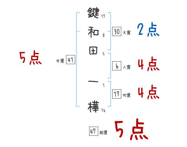 総運![]() | 鍵和田一樺さんの総運は47画の5つ星!実力が開花し発展する円満な人生。財に恵まれる。 あなたの人生を表す1番重要な運勢です。生涯を通じて影響する総合運となり、主に50歳以降の晩年期に影響を及ぼします。 |