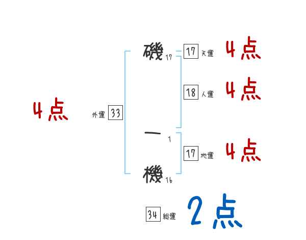 総運![]() | 磯一機さんの総運は34画の2つ星!独創性に優れるが、自尊心が強く災難に注意しましょう。 あなたの人生を表す1番重要な運勢です。生涯を通じて影響する総合運となり、主に50歳以降の晩年期に影響を及ぼします。 |