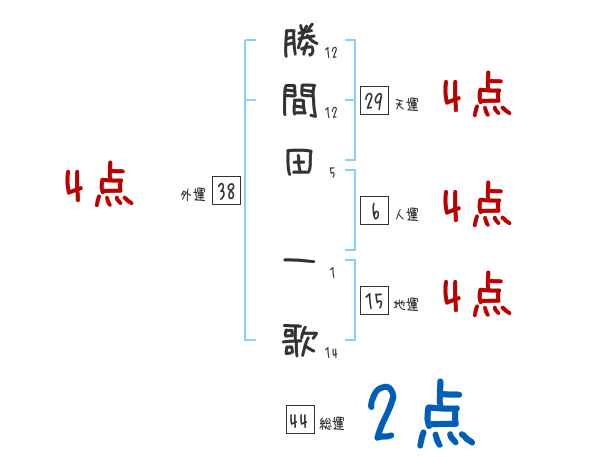 総運![]() | 勝間田一歌さんの総運は44画の2つ星!誠実で慎重な性格。物事を考えすぎないように注意しましょう。 あなたの人生を表す1番重要な運勢です。生涯を通じて影響する総合運となり、主に50歳以降の晩年期に影響を及ぼします。 |
