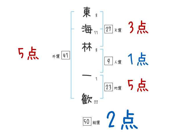 総運![]() | 東海林一歓さんの総運は50画の2つ星!浮き沈みが激しく不安定。しりすぼみに衰退しやすいので注意しましょう。 あなたの人生を表す1番重要な運勢です。生涯を通じて影響する総合運となり、主に50歳以降の晩年期に影響を及ぼします。 |