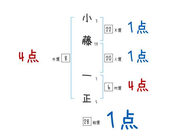 総運![]() | 小藤一正さんの総運は28画の1つ星!家庭環境に注意。スポーツで活躍できる能力があるかも。 あなたの人生を表す1番重要な運勢です。生涯を通じて影響する総合運となり、主に50歳以降の晩年期に影響を及ぼします。 |