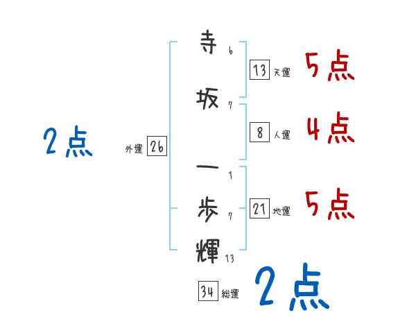 外運![]() | 寺坂一歩輝さんの外運は26画の2つ星!波瀾万丈かも。信頼できる人を大事にしましょう。 生活面を象徴する運勢です。外部から受ける影響力を表し、結婚運、家庭運や職場、環境への順応性を表します。 |