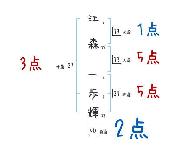 人運![]() | 江森一歩輝さんの人運は13画の5つ星!才能に恵まれ人気がある。名声を手に入れる。円満な人生。 性格や才能などを表す2番目に重要な運勢です。人間関係や協調性、社会的な成功に影響します。主に20歳から50歳ぐらいまでの中年期の運勢を表します。 |