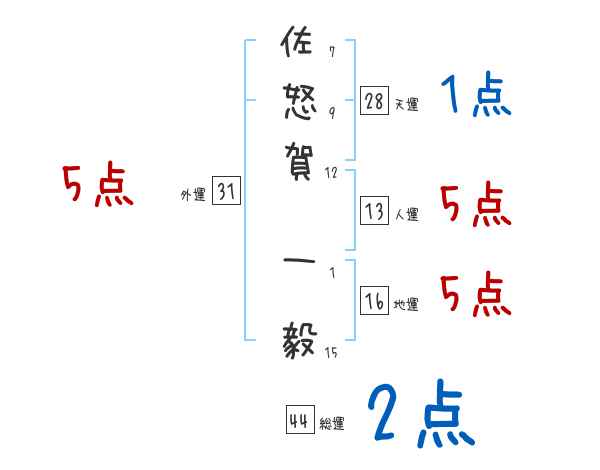 総運![]() | 佐怒賀一毅さんの総運は44画の2つ星!誠実で慎重な性格。物事を考えすぎないように注意しましょう。 あなたの人生を表す1番重要な運勢です。生涯を通じて影響する総合運となり、主に50歳以降の晩年期に影響を及ぼします。 |