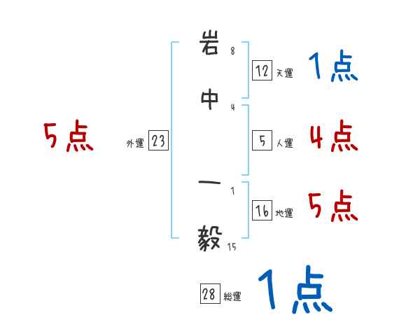 地運![]() | 岩中一毅さんの地運は16画の5つ星!人望が厚く大きく発展する。逆転成功が見える。 個性を表す基礎的な運勢です。性格形成や対人関係、行動力など家庭環境に影響されます。主に誕生してから20歳くらいまでの若年期の運勢を表します。 |