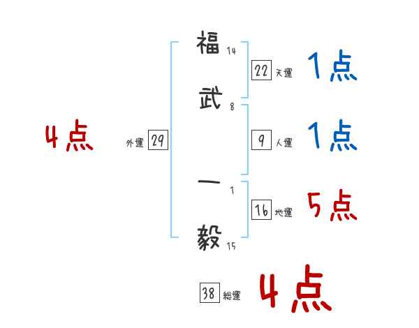 天運![]() | 福武一毅さんの天運は22画の1つ星!努力することが苦手ないっぽう手先が器用。芸術性にも優れる。 家系が持つ宿命的な運勢を表します。祖先から受け継いだ苗字ですので自分の力が及びません。家柄を象徴します。 |
