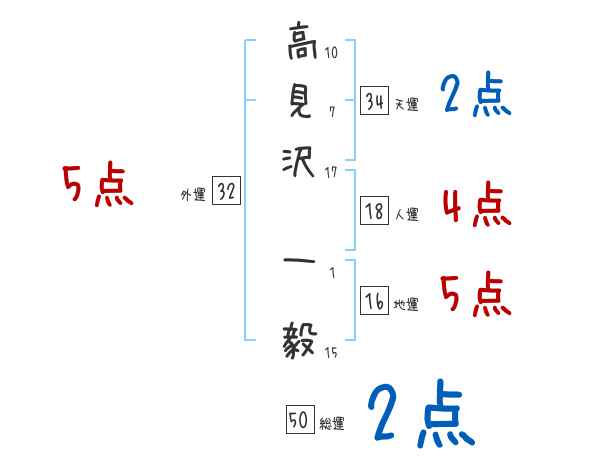 外運![]() | 高見沢一毅さんの外運は32画の5つ星!柔軟性があり成功する。チャンスが多く金運が良い。 生活面を象徴する運勢です。外部から受ける影響力を表し、結婚運、家庭運や職場、環境への順応性を表します。 |