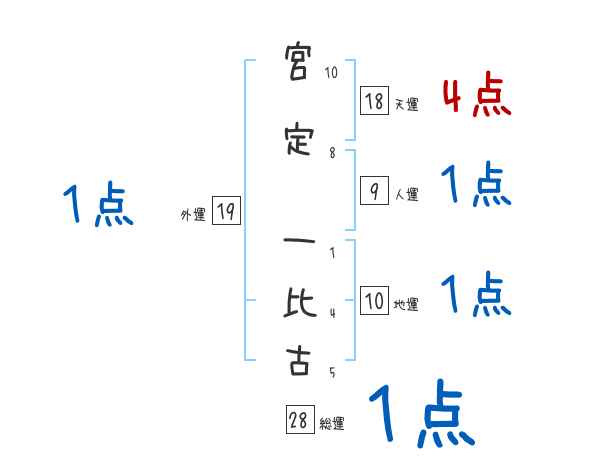 天運![]() | 宮定一比古さんの天運は18画の4つ星!情熱的で剛気。忍耐力があり信頼される。 家系が持つ宿命的な運勢を表します。祖先から受け継いだ苗字ですので自分の力が及びません。家柄を象徴します。 |
