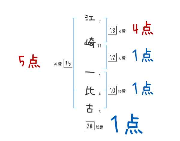 外運![]() | 江崎一比古さんの外運は16画の5つ星!人望が厚く大きく発展する。逆転成功が見える。 生活面を象徴する運勢です。外部から受ける影響力を表し、結婚運、家庭運や職場、環境への順応性を表します。 |
