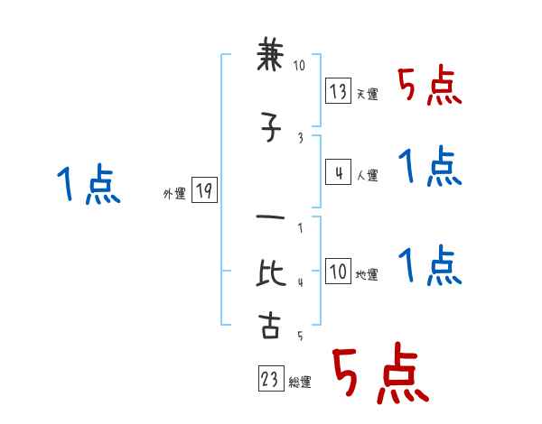 外運![]() | 兼子一比古さんの外運は19画の1つ星!優れた才能を持ちますが、協調性が足りないことも。周りの人と協力する事を意識しましょう。 生活面を象徴する運勢です。外部から受ける影響力を表し、結婚運、家庭運や職場、環境への順応性を表します。 |