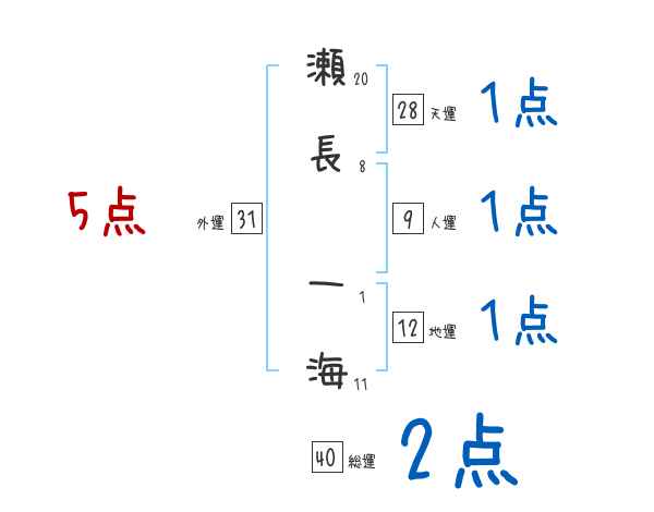 天運![]() | 瀬長一海さんの天運は28画の1つ星!家庭環境に注意。スポーツで活躍できる能力があるかも。 家系が持つ宿命的な運勢を表します。祖先から受け継いだ苗字ですので自分の力が及びません。家柄を象徴します。 |