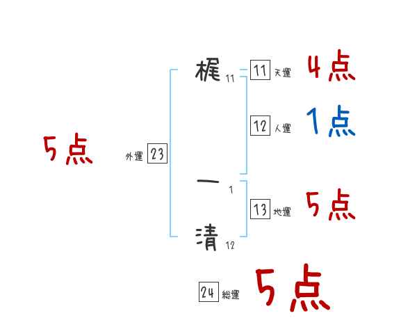 天運![]() | 梶一清さんの天運は11画の4つ星!着実に富や地位を得る幸運な人生。 家系が持つ宿命的な運勢を表します。祖先から受け継いだ苗字ですので自分の力が及びません。家柄を象徴します。 |