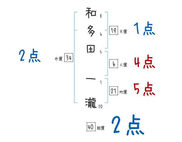 地運![]() | 和多田一瀧さんの地運は21画の5つ星!統率力がある。独立し成功する。名誉を手に入れる。 個性を表す基礎的な運勢です。性格形成や対人関係、行動力など家庭環境に影響されます。主に誕生してから20歳くらいまでの若年期の運勢を表します。 |