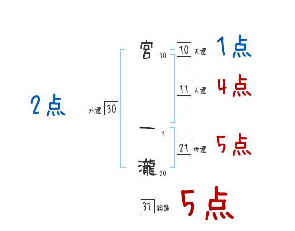 総運![]() | 宮一瀧さんの総運は31画の5つ星!社交性があり判断力に優れる。順風満帆な人生で円満な生活。 あなたの人生を表す1番重要な運勢です。生涯を通じて影響する総合運となり、主に50歳以降の晩年期に影響を及ぼします。 |