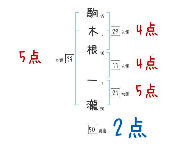 外運![]() | 駒木根一瀧さんの外運は39画の5つ星!社交性に優れ人望が厚い。人の上に立ち成功する。 生活面を象徴する運勢です。外部から受ける影響力を表し、結婚運、家庭運や職場、環境への順応性を表します。 |