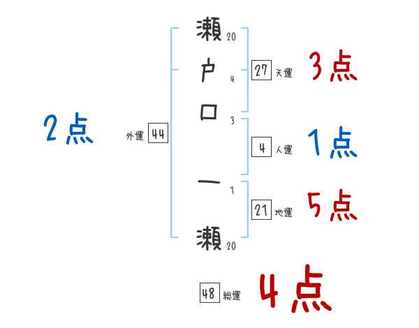 天運![]() | 瀬戸口一瀬さんの天運は27画の3つ星!頭脳明晰だが強情で摩擦が多い傾向。孤立に注意。 家系が持つ宿命的な運勢を表します。祖先から受け継いだ苗字ですので自分の力が及びません。家柄を象徴します。 |