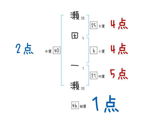 総運![]() | 瀬田一瀬さんの総運は46画の1つ星!迷走することが多く苦労するかも。目先のことにとらわれないように。 あなたの人生を表す1番重要な運勢です。生涯を通じて影響する総合運となり、主に50歳以降の晩年期に影響を及ぼします。 |