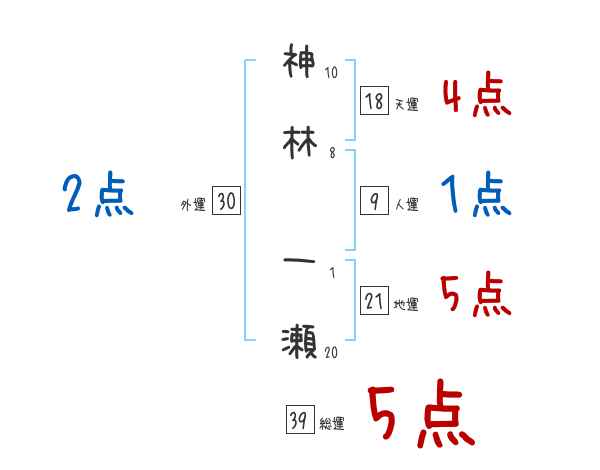 総運![]() | 神林一瀬さんの総運は39画の5つ星!社交性に優れ人望が厚い。人の上に立ち成功する。 あなたの人生を表す1番重要な運勢です。生涯を通じて影響する総合運となり、主に50歳以降の晩年期に影響を及ぼします。 |