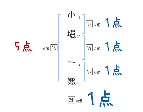 外運![]() | 小堀一熙さんの外運は16画の5つ星!人望が厚く大きく発展する。逆転成功が見える。 生活面を象徴する運勢です。外部から受ける影響力を表し、結婚運、家庭運や職場、環境への順応性を表します。 |