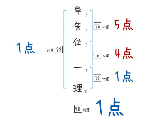 総運![]() | 早矢仕一理さんの総運は28画の1つ星!家庭環境に注意。スポーツで活躍できる能力があるかも。 あなたの人生を表す1番重要な運勢です。生涯を通じて影響する総合運となり、主に50歳以降の晩年期に影響を及ぼします。 |