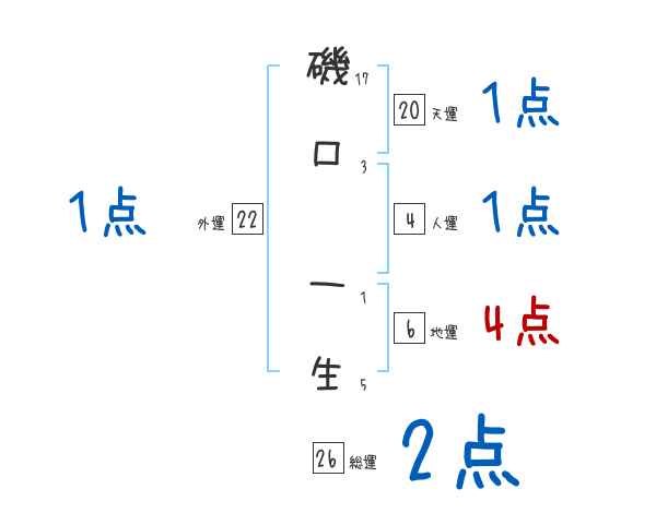 天運![]() | 磯口一生さんの天運は20画の1つ星!社交が苦手。人とは違った才能があり波乱万丈な人生かも。 家系が持つ宿命的な運勢を表します。祖先から受け継いだ苗字ですので自分の力が及びません。家柄を象徴します。 |
