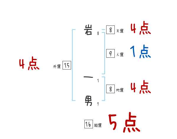 外運![]() | 岩一男さんの外運は15画の4つ星!人徳があり出世する。順調に物事を進め円満な人生。 生活面を象徴する運勢です。外部から受ける影響力を表し、結婚運、家庭運や職場、環境への順応性を表します。 |