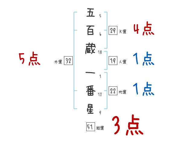 総運![]() | 五百蔵一番星さんの総運は51画の3つ星!変化が激しく、危険に注意。堅実な性格。 あなたの人生を表す1番重要な運勢です。生涯を通じて影響する総合運となり、主に50歳以降の晩年期に影響を及ぼします。 |