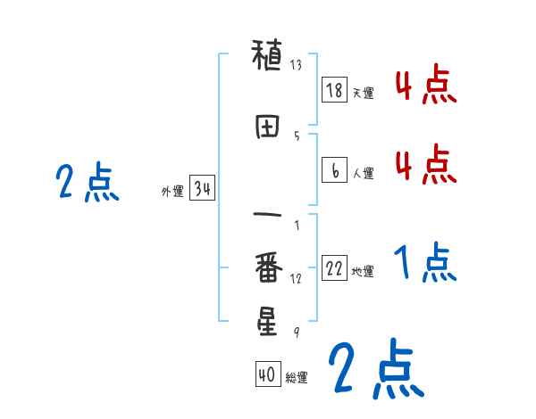 天運![]() | 稙田一番星さんの天運は18画の4つ星!情熱的で剛気。忍耐力があり信頼される。 家系が持つ宿命的な運勢を表します。祖先から受け継いだ苗字ですので自分の力が及びません。家柄を象徴します。 |