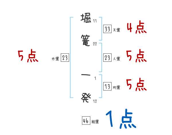 天運![]() | 堀篭一発さんの天運は33画の4つ星!権力志向でプライドが高い。勇気があり運を切り開き成功する。 家系が持つ宿命的な運勢を表します。祖先から受け継いだ苗字ですので自分の力が及びません。家柄を象徴します。 |