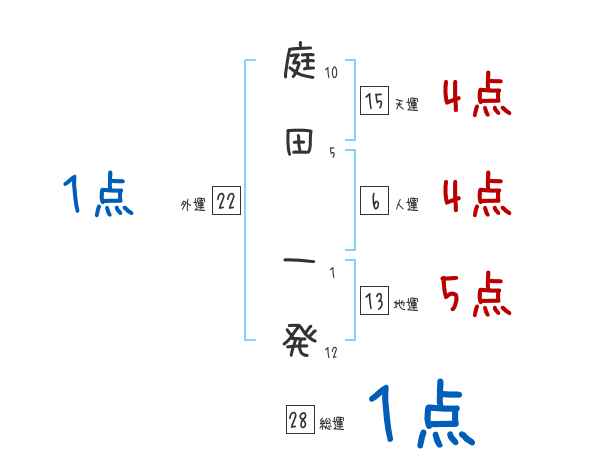 総運![]() | 庭田一発さんの総運は28画の1つ星!家庭環境に注意。スポーツで活躍できる能力があるかも。 あなたの人生を表す1番重要な運勢です。生涯を通じて影響する総合運となり、主に50歳以降の晩年期に影響を及ぼします。 |