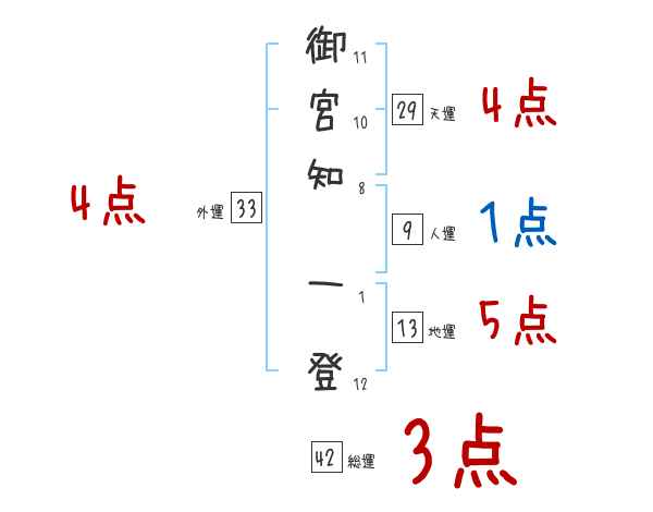 外運![]() | 御宮知一登さんの外運は33画の4つ星!権力志向でプライドが高い。勇気があり運を切り開き成功する。 生活面を象徴する運勢です。外部から受ける影響力を表し、結婚運、家庭運や職場、環境への順応性を表します。 |