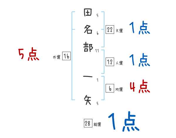 外運![]() | 田名部一矢さんの外運は16画の5つ星!人望が厚く大きく発展する。逆転成功が見える。 生活面を象徴する運勢です。外部から受ける影響力を表し、結婚運、家庭運や職場、環境への順応性を表します。 |