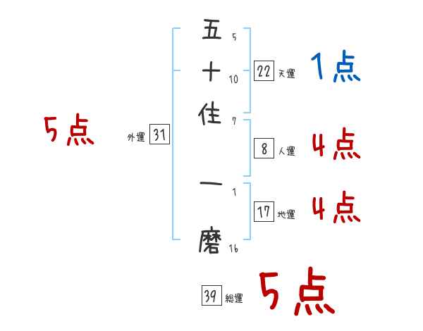 総運![]() | 五十住一磨さんの総運は39画の5つ星!社交性に優れ人望が厚い。人の上に立ち成功する。 あなたの人生を表す1番重要な運勢です。生涯を通じて影響する総合運となり、主に50歳以降の晩年期に影響を及ぼします。 |