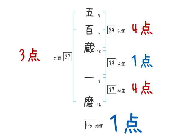 総運![]() | 五百蔵一磨さんの総運は46画の1つ星!迷走することが多く苦労するかも。目先のことにとらわれないように。 あなたの人生を表す1番重要な運勢です。生涯を通じて影響する総合運となり、主に50歳以降の晩年期に影響を及ぼします。 |