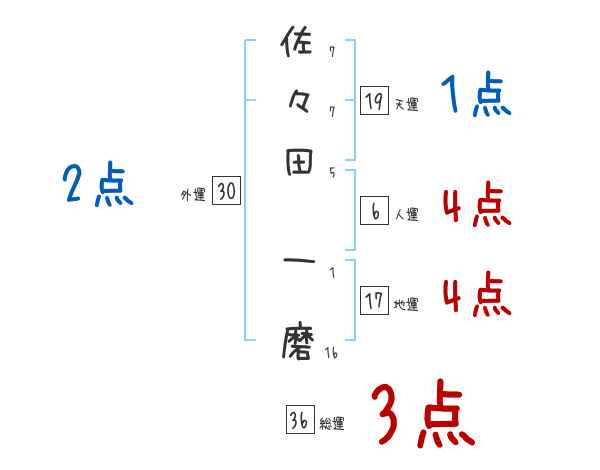 総運![]() | 佐々田一磨さんの総運は36画の3つ星!先見性が豊かです。多少神経質で苦労することも。 あなたの人生を表す1番重要な運勢です。生涯を通じて影響する総合運となり、主に50歳以降の晩年期に影響を及ぼします。 |