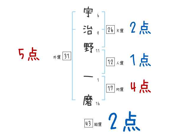総運![]() | 宇治野一磨さんの総運は43画の2つ星!頑固な性格で独立心が強いかも。やや非現実的で浪費に注意しましょう。 あなたの人生を表す1番重要な運勢です。生涯を通じて影響する総合運となり、主に50歳以降の晩年期に影響を及ぼします。 |