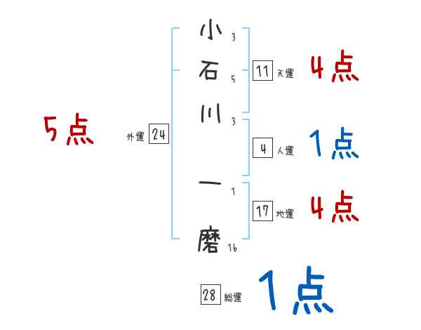 総運![]() | 小石川一磨さんの総運は28画の1つ星!家庭環境に注意。スポーツで活躍できる能力があるかも。 あなたの人生を表す1番重要な運勢です。生涯を通じて影響する総合運となり、主に50歳以降の晩年期に影響を及ぼします。 |