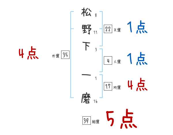 外運![]() | 松野下一磨さんの外運は35画の4つ星!温厚な性格で感受性が高い。穏和な性格で人望が厚い。 生活面を象徴する運勢です。外部から受ける影響力を表し、結婚運、家庭運や職場、環境への順応性を表します。 |