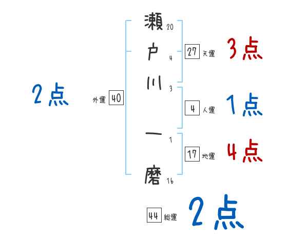 総運![]() | 瀬戸川一磨さんの総運は44画の2つ星!誠実で慎重な性格。物事を考えすぎないように注意しましょう。 あなたの人生を表す1番重要な運勢です。生涯を通じて影響する総合運となり、主に50歳以降の晩年期に影響を及ぼします。 |