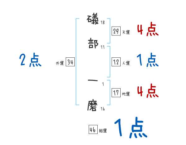 外運![]() | 礒部一磨さんの外運は34画の2つ星!独創性に優れるが、自尊心が強く災難に注意しましょう。 生活面を象徴する運勢です。外部から受ける影響力を表し、結婚運、家庭運や職場、環境への順応性を表します。 |