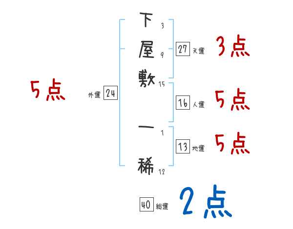 人運![]() | 下屋敷一稀さんの人運は16画の5つ星!人望が厚く大きく発展する。逆転成功が見える。 性格や才能などを表す2番目に重要な運勢です。人間関係や協調性、社会的な成功に影響します。主に20歳から50歳ぐらいまでの中年期の運勢を表します。 |
