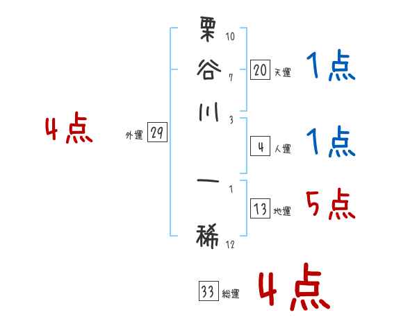 外運![]() | 栗谷川一稀さんの外運は29画の4つ星!完全主義で才能がある。厳格な心の持ち主。 生活面を象徴する運勢です。外部から受ける影響力を表し、結婚運、家庭運や職場、環境への順応性を表します。 |