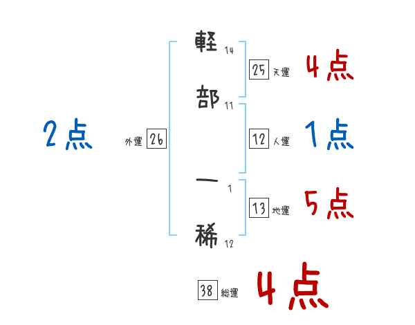 外運![]() | 軽部一稀さんの外運は26画の2つ星!波瀾万丈かも。信頼できる人を大事にしましょう。 生活面を象徴する運勢です。外部から受ける影響力を表し、結婚運、家庭運や職場、環境への順応性を表します。 |