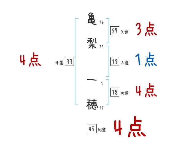 総運![]() | 亀梨一穂さんの総運は45画の4つ星!もくもくと物事を進め達成する。地味な努力家。 あなたの人生を表す1番重要な運勢です。生涯を通じて影響する総合運となり、主に50歳以降の晩年期に影響を及ぼします。 |